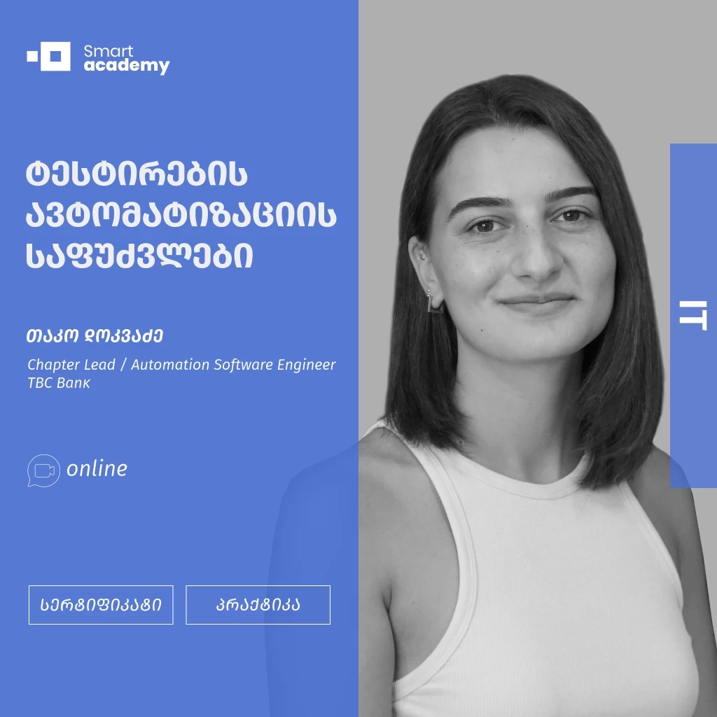 - თაკო არის ტესტირების ავტომატიზაციის ინჟინერი/Chapter lead TBC ბანკში. მის მოვალეობებში შედის სხვადასხვა სახის პროექტებში ავტომატური ტესტების წერის უზრუნველყოფა და გამართული, უწყვეტი ავტომატური ტესტირების პროცესის აწყობა