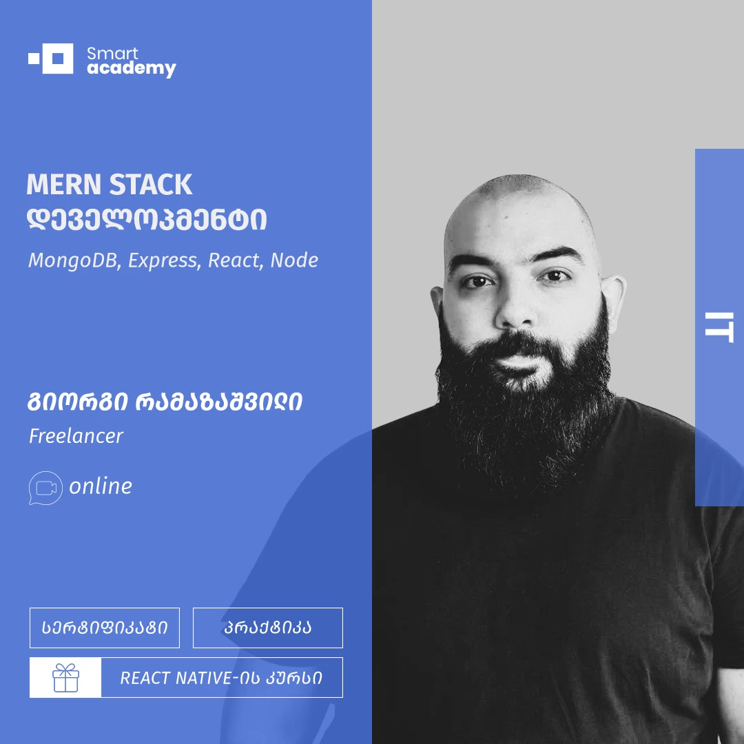 MERN (Mongo, Express, React.js, Node.js) Stack დეველოპმენტის კურსის მიზანია სტუდენტებს შეასწავლოს მყარი ფუნდამენტი React.js და Node.js-ზე დაფუძნებული მცირე და საშუალო ზომის web აპლიკაციების შესაქმნელად და მოამზადოს სტუდენტი ამ მიმართულებით ჯუნიორ პოზიციაზე დასასაქმებლად.
